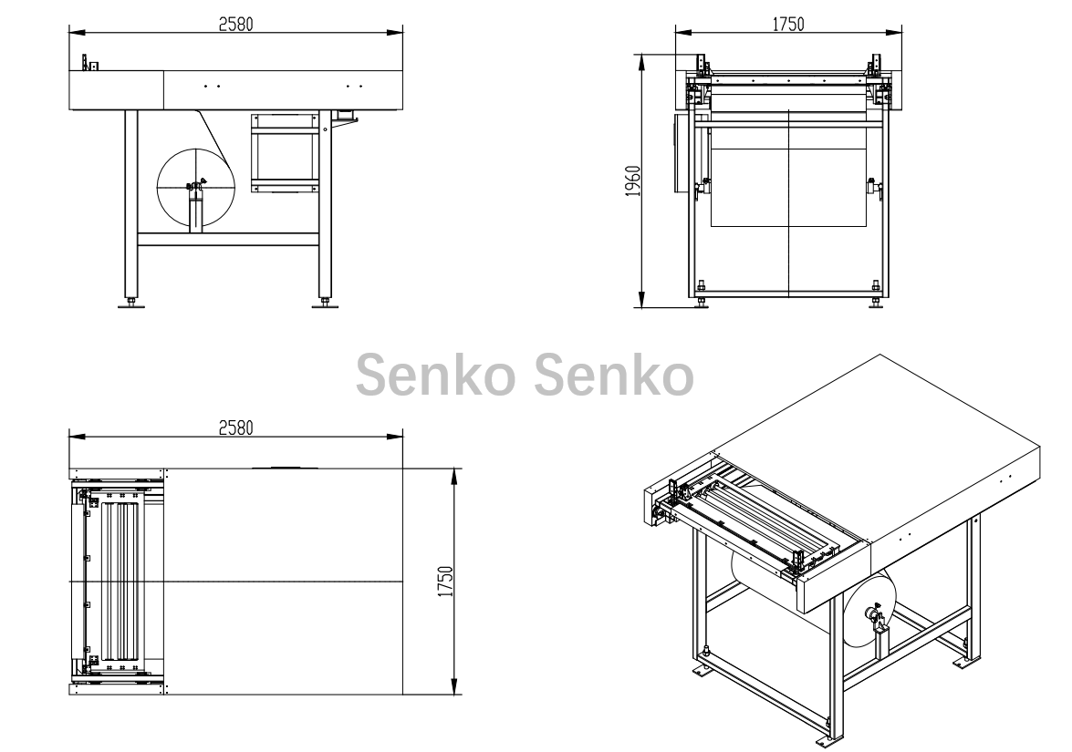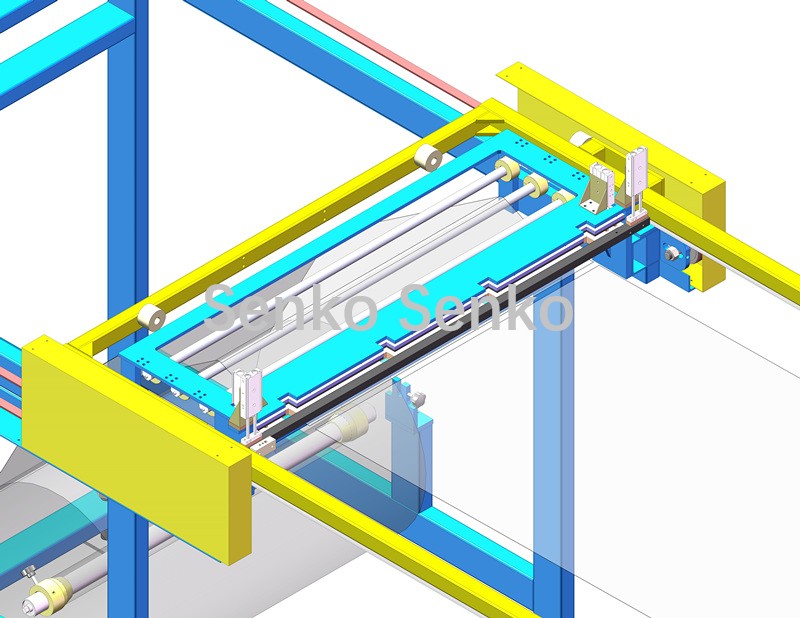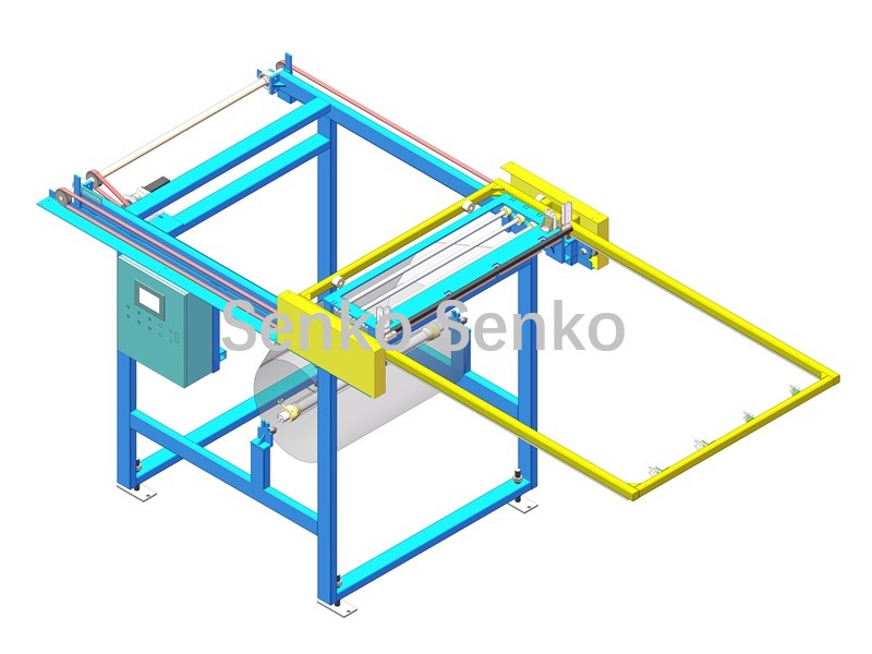 伺服电机带动夹膜机构,将膜夹住伸出,伺服定长后,切刀将膜切断。拉膜机构继续前进,夹手放开,膜掉落至砖垛表面上方。夹手收回,等待下一次覆膜。