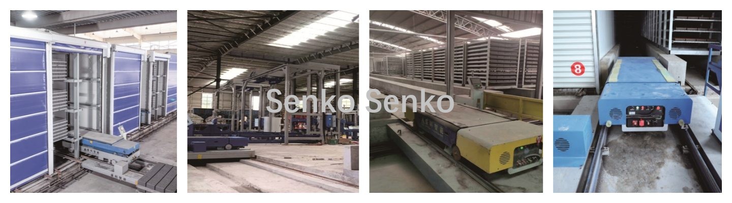 解决砌块砖简易生产线后续工序采用叉车转运的人工及油耗问题,与砌块简易生产线及智能码砖机实现无缝连接,组成砌块砖成型、养护、打包全流程生产机械自动化,实现智能制砖,母摆渡采用伺服传动定位,搬运小车出入窑,从而实现蒸汽养护。