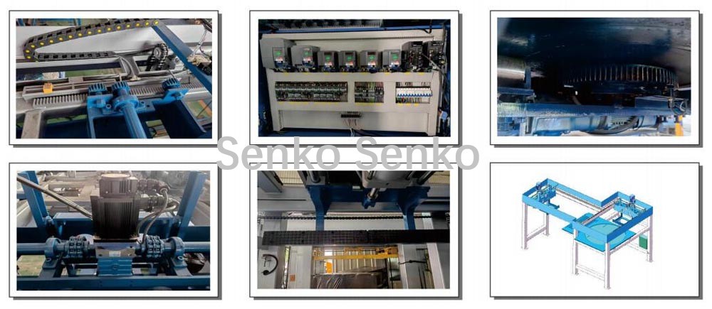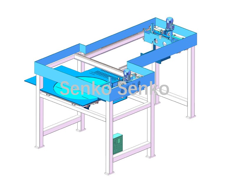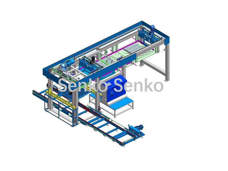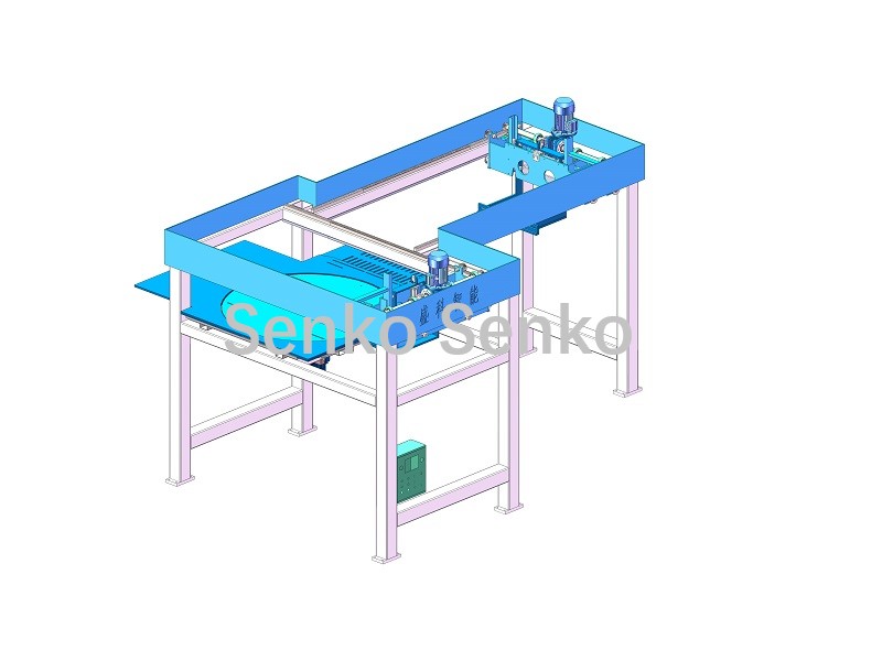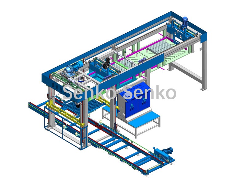 整机由抬板装置,码垛主机,推板/翻面,码板机等部分组成,实现码砖垛无底托盘。整机采用伺服电机及气动为驱动动力,电气驱动均变频调速,具备智能、稳定、快速、低功耗、占用场地小等特点。此设备生产线优垫为整体自动程度高,整个流程由电脑操控柜控制,不仅降低了人工成本,还提高了效率和产量。