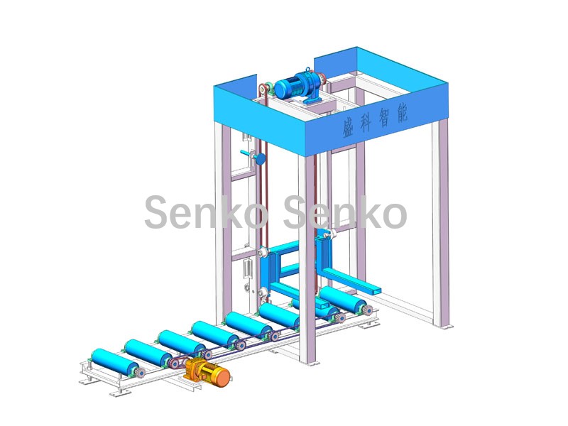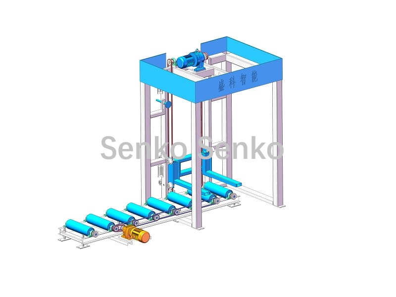 被推入的空托板逐板依次下降,实现空托板叠垒,叠垒成垛后,下降到底部,输送机把堆垛后的托板送出,由叉车叉离。