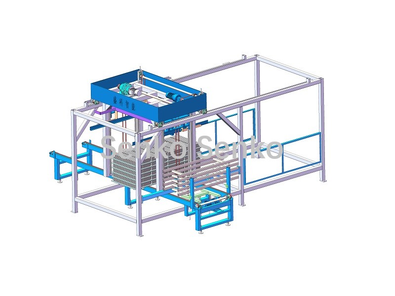 智能码垛机是采用预留间隙的码垛编排方法的专利技术而设计的智能码砖装备。该装备码垛系统解决了目前简易型砌块生产线成品砖需由人工码垛,劳动强度大、生产效率低、成品出货装卸机械化低等问题,该设备是最新研发的一种快速码垛系统。一般情况下,本系统独立放置于产品养护堆场附近,对于养护好的制品就地码垛,亦可与砌块生产线相串联起来,实现在线码垛。