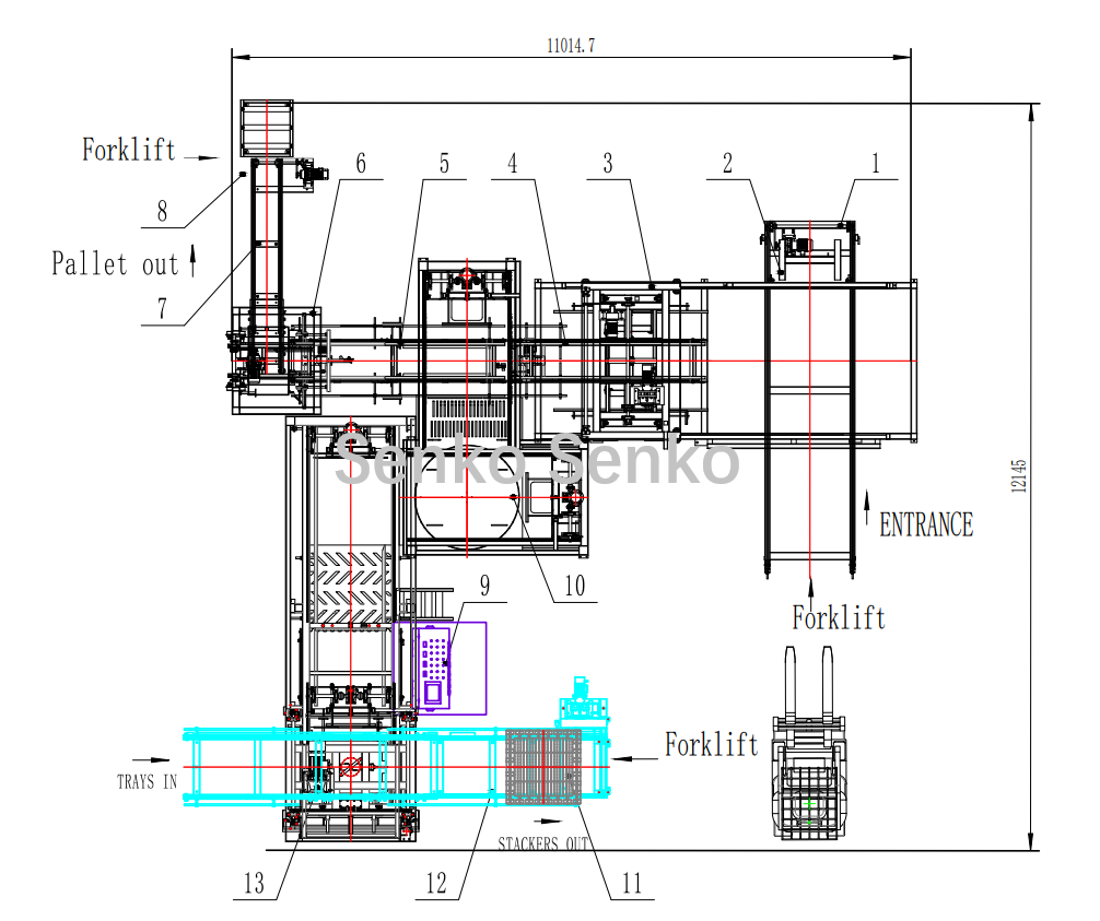| 1.托盘卸货架 | 2. 车架回收 | 3.托盘升降机 | 4. 托盘输送机 | 5. 空托盘输送机 |