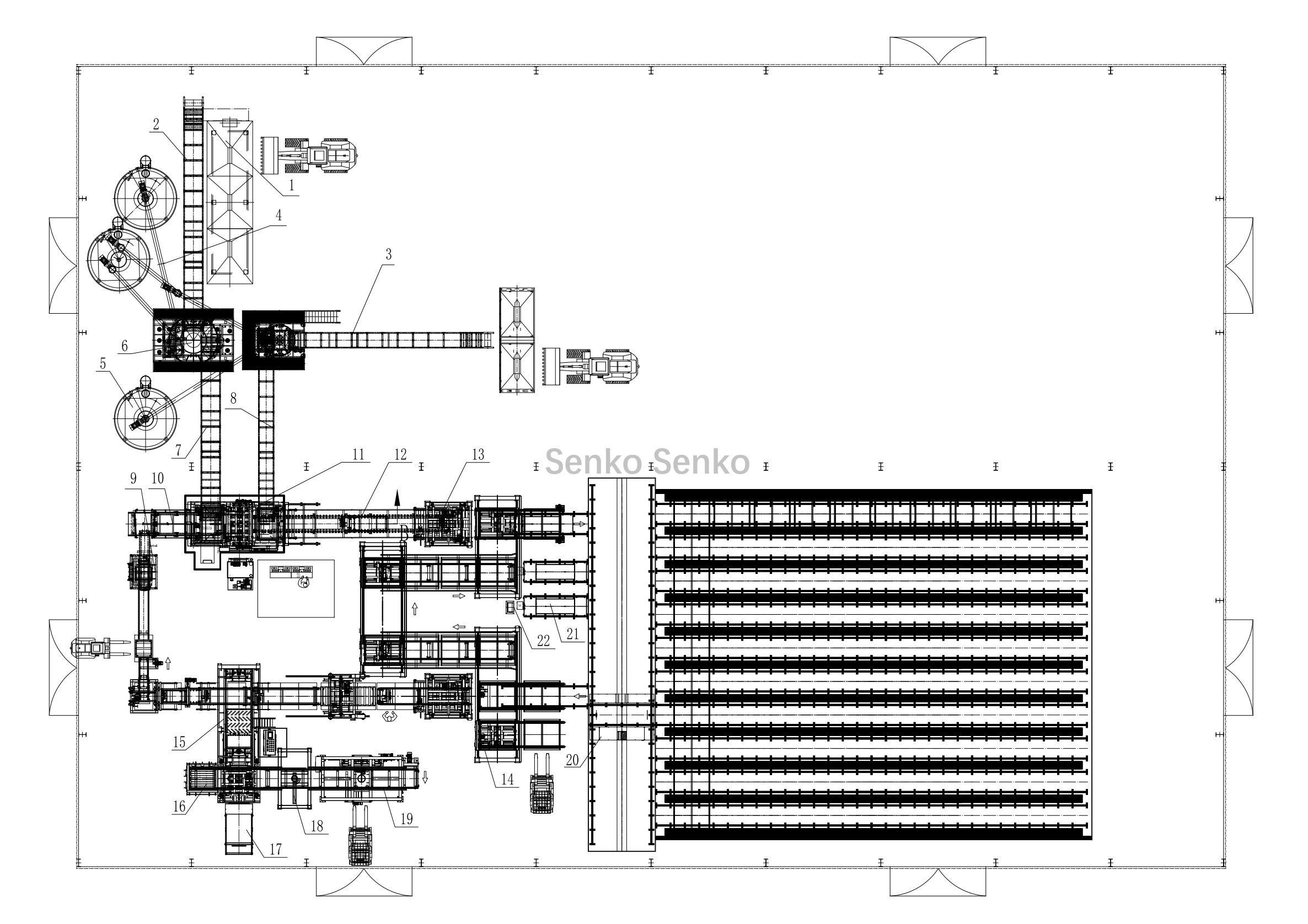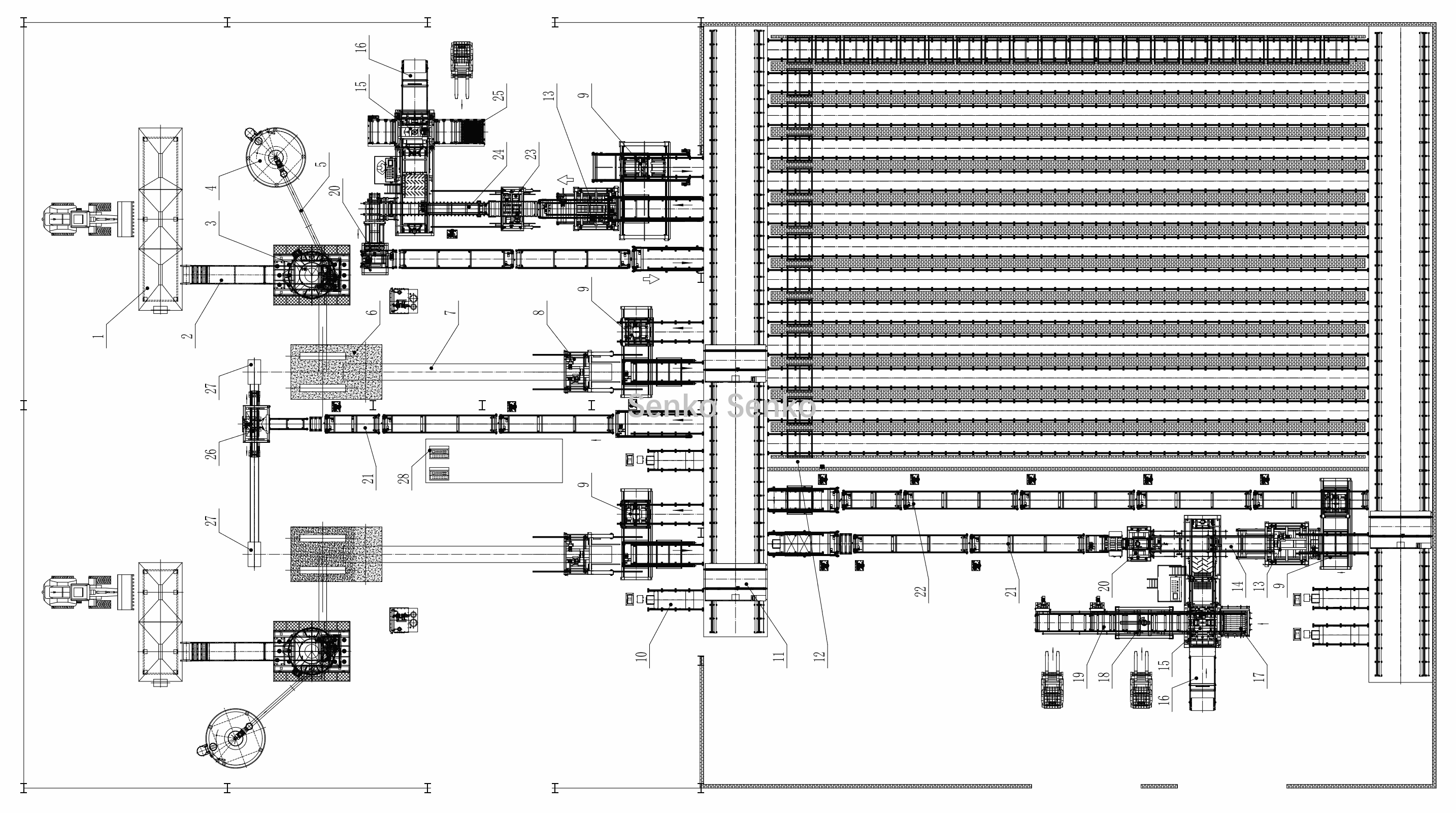 | 25、接垛输送 | 26、上板机 | 27、板箱 | 28、控制室 |