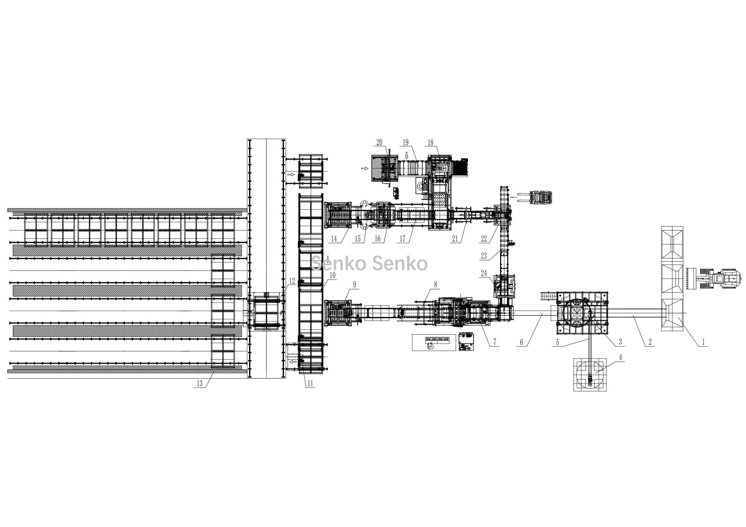 | 19、栈板输送 | 20、码板机 | 21、回板输送 | 22、回架输送 | 23、抬板机 | 24、送砖架 |